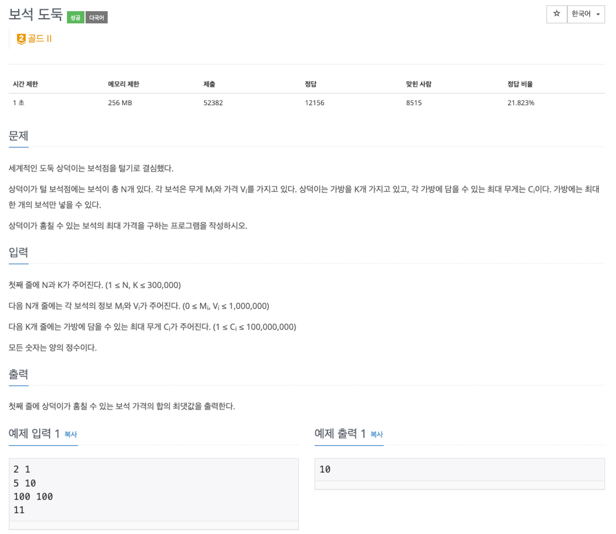 먼저 각 가방에 담을 수 있는 보석의 최대 가격을 구하는 문제라서