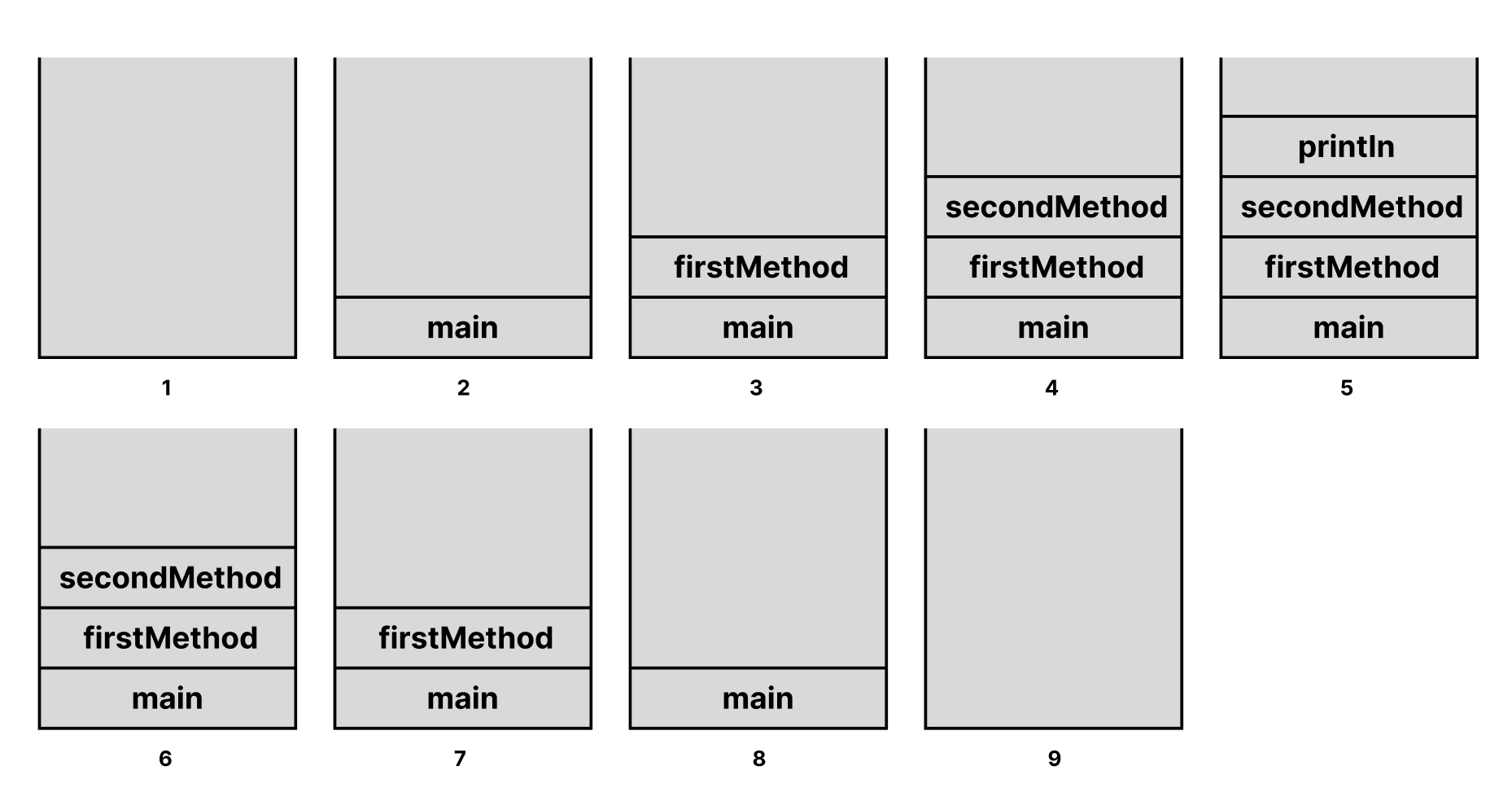- 8 : firstMethod() 가 종료되고, 자신을 호출한 main 메소드로 돌아간다.