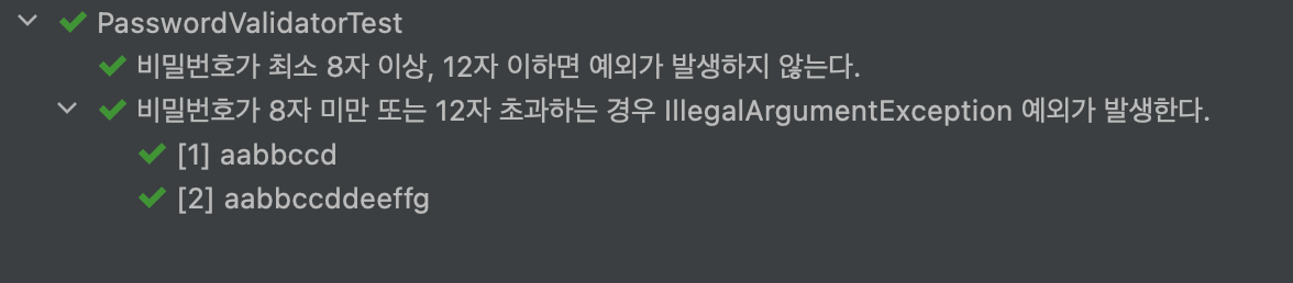 - 비밀번호가 8자 미만 또는 12자 초과인 경우 IllegalArgumentException 예외를 발생시킨다.
